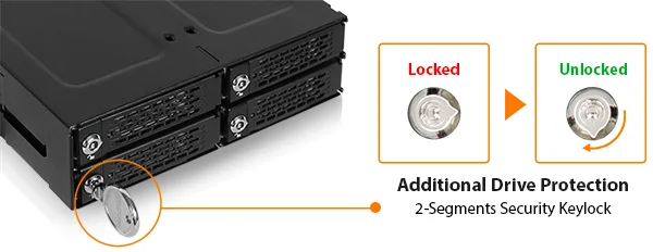 Aby zapewnić najwyższą wydajność chłodzenia, MB720MK-B V3 wyposażono w podwójne wentylatory chłodzące z tyłu. Skutecznie rozpraszają one ciepło generowane przez szybkie dyski SSD PCIe 4.0. Co więcej, każda tacka na dyski ma bardzo dużą pokrywę radiatora i podkładkę termiczną, utrzymując dyski SSD w optymalnych temperaturach. Jako część najtwardszej linii ICY DOCK, MB720MK-B V3 ma w pełni metalową konstrukcję oraz metalowe beczkowe zamki na klucz, zapewniając maksymalną ochronę cennych dysków.