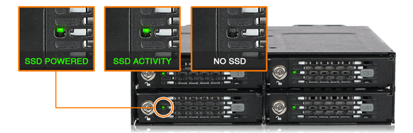 Ponieważ dyski SSD M.2 NVMe są znane z generowania wysokich temperatur, konieczne jest utrzymywanie temperatur roboczych przez cały czas, aby zapobiec spadkowi wydajności. Każda tacka na dyski jest wyposażona w bardzo dużą, wysokowydajną aluminiową pokrywę radiatora i podkładkę termiczną.