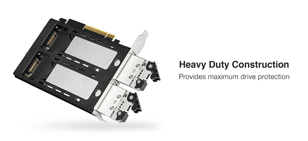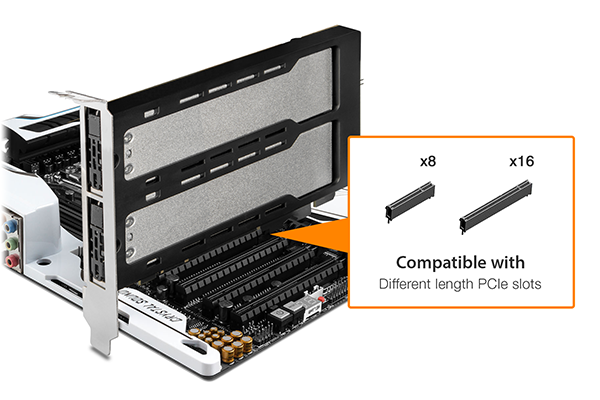 Wykorzystuje pojedyncze gniazdo PCIe 3.0/4.0 x8 lub x16 (do uzyskania dostępu do obu dysków wymagana jest bifurkacja PCIe x4, x4, x4 dla PCIe 16x i x4, x4 dla PCIe 8x)